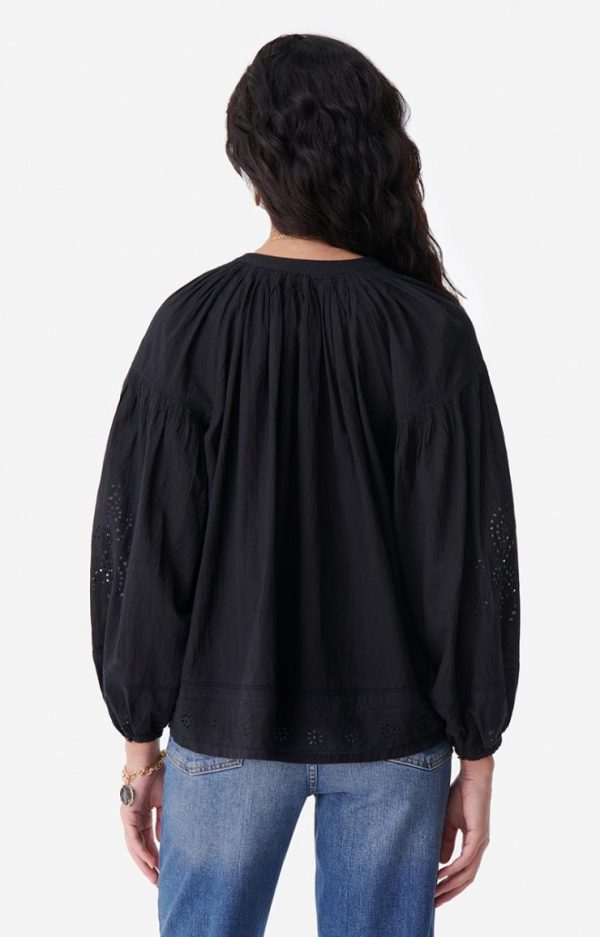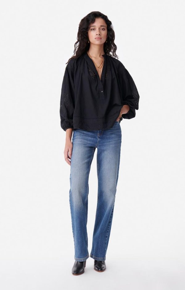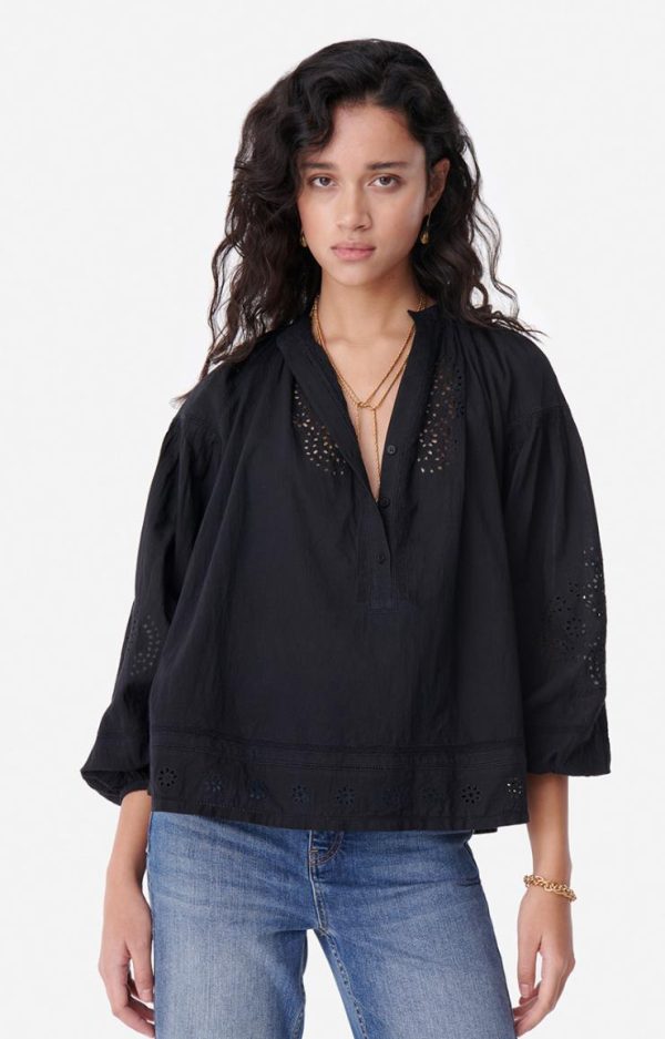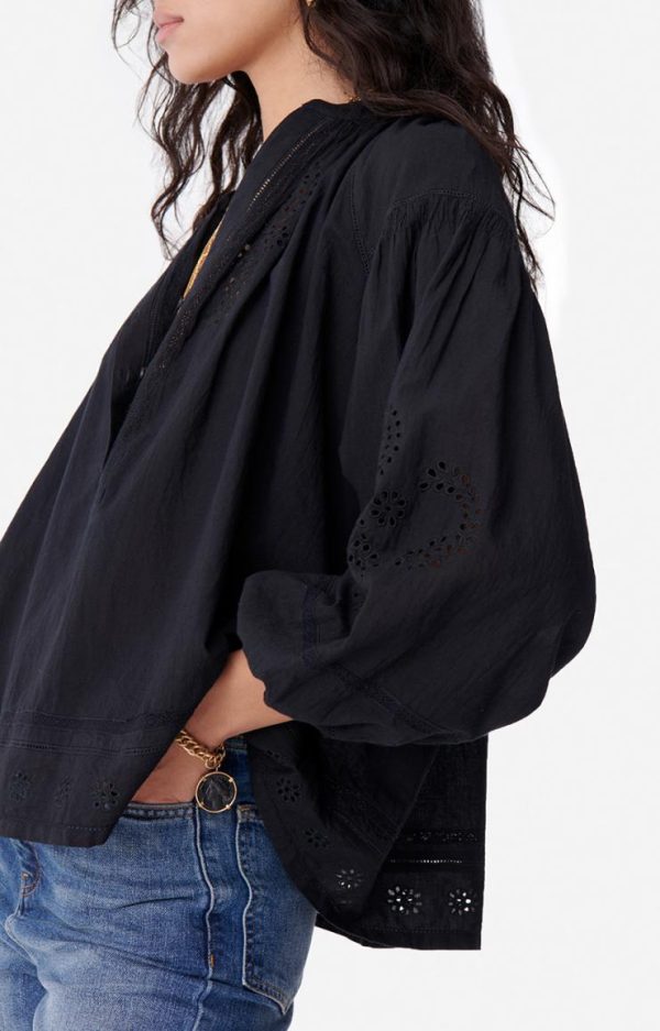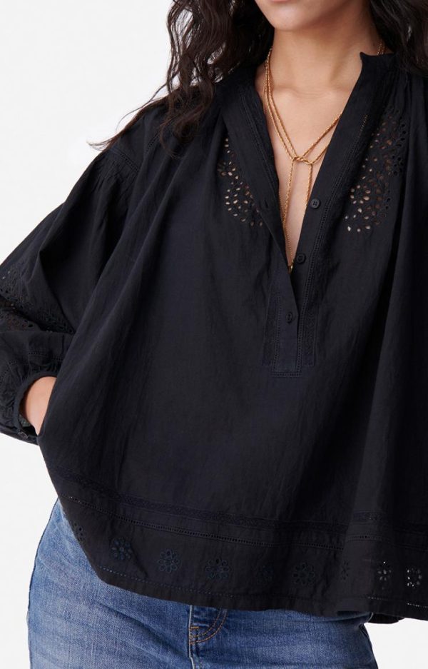 Blouse emblématique de la maison. Sa coupe aérienne confectionnée dans coton léger, fait de Nipoa la blouse romantique par excellence. Avec ses détails de fronces au niveau des manches, sa silhouette se déssine par ses épaules tombantes et son volume ample. Elle se porte avec un jean ou une jupe. Elle se déline ici avec des détails de broderies anglaise, un jeu de dentelle appliquée et incrustée.