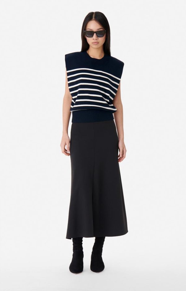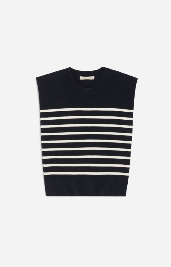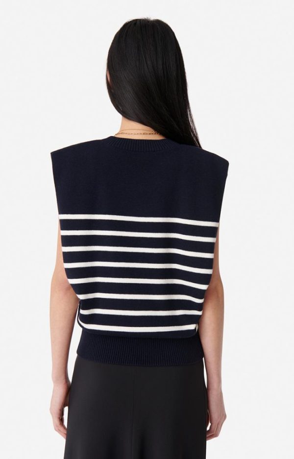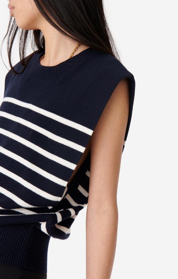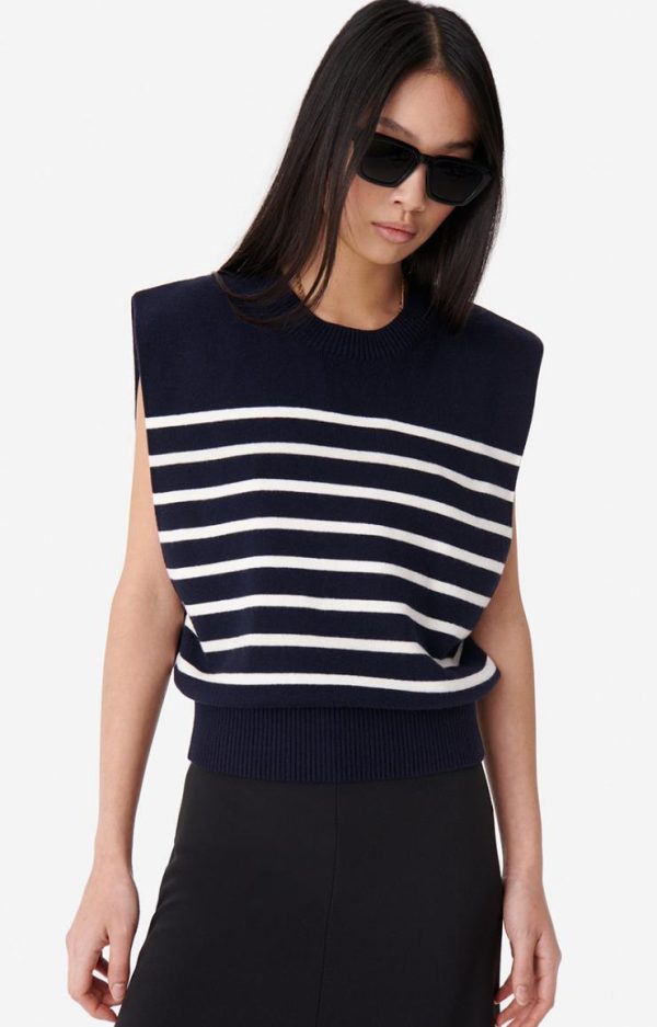 Confectionné dans un mélange de coton et de laine mérinos, ce pull à l’aspect débardeur est aussi cool que chic. Sa silhouette se dessine avec ses épaules structurées, son volume blousonné, sa taille marquée en tricot bord-côtes, et ses emmanchures profondes. Se porte avec de grandes chemises oversized.