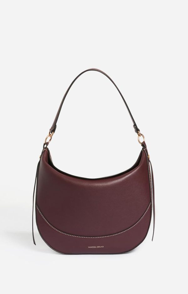 Sac demi-lune en cuir lisse. Porté main, épaule ou crossbody.
